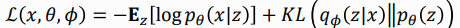 $$\mathcal{L}(\theta, \phi, x^{(i)}) \simeq -D_{\mathrm{KL}}(q_{\phi}(z|x^{(i)}) || p_{\theta}(z)) + \mathbb{E}_{q_{\phi}(z|x^{(i)})}[\log p_{\theta}(x^{(i)}|z)]$$