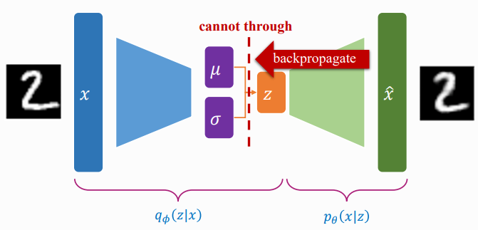 이 때 새로운 vector인 $\epsilon$을 이용해서 새로운 확률 변수를 계산한다. 예를들어 $\mu$와 $\sigma$를 알 때 $\mu + \sigma*\epsilon$과 같이 확률 변수를 사용하는 것이다.