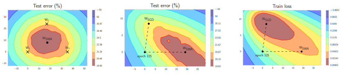 [Izmailov et al. 2018] 논문에서 제안된 Stochastic Weight Averaging(SWA) 방법에서는 single optimization trajectory에서 weight를 평균낼 때 성능이 좋아지는 것을 보여준다. 예를 들어 왼쪽의 Test error 그림에서 보이는 W1, W2, W3 값을 평균 낼 경우, error 값이 해당 landscape에서 가장 낮은 bound로 이동하는 것을 볼 수 있다.