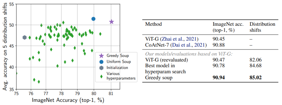 2. 좋은 모델만 선택해 가중치를 평균내는 Greedy Soup 방식으로 Image, Text task에서 높은 성능을 얻음