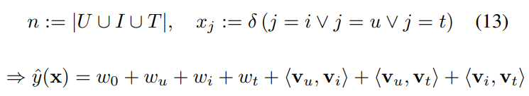 FM 모델은 같은 User와 Item 조합안의 두 태그 사이에 랭킹이 사용되기 때문에 ($u, i, t_A$)와 ($u, i,t_B$) score 차이에 대한 최적화와 예측이 적용된다. 이를 고려하면 아래와 같은 식이 구성된다.