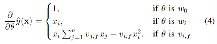 FM 모델은 선형적으로 계산되기 때문에 Gradient Method를 사용하면 모델 파라미터가 효율적으로 학습된다. (SGD와 같은 최적화, 다양한 loss function을 사용할 수 있음)