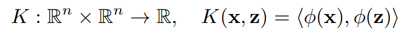 $\phi$ : feature vector인 $\mathbb{R}$를 더 complex한 $\mathcal{F}$ space로 매핑하는 함수로 Kernel과 위의 관계를 가진다.