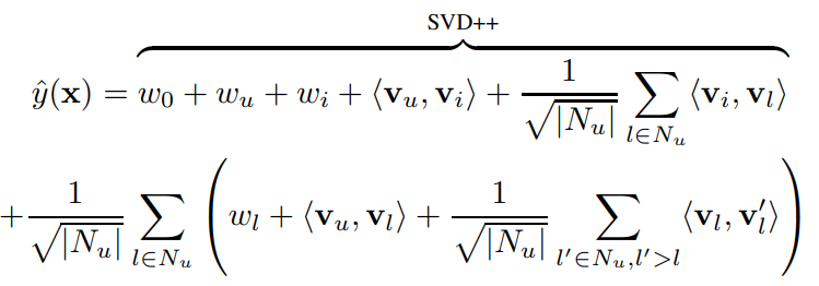 FM 모델은 초반은 SVD++ 모델과 동일하지만, 영화($N_u$)끼리의 Interaction이나 유저와 영화의 Interaction을 고려하는 부분을 포함한다.