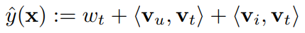 C의 Tag Recommendation 처럼 이 모델은 Ranking에 사용되기 때문에 ($u, i_A, t$)와 ($u, i_B, t$) 사이의 Score 차이가 prediction과 optimization의 기준으로 사용된다. 그러므로 위에서 추가된 식 중 $i$에 대한 식이 아닌 경우 사라지게 되어 아래의 FM 식이 만들어진다.