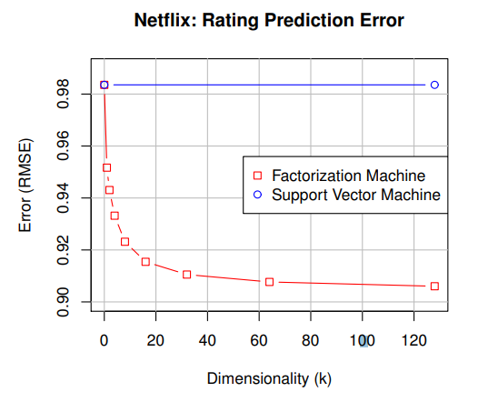 SVM 모델은 Sparse Data에서 학습이 잘 되지 않았고 FM 모델은 차원이 증가하며 Error가 줄어드는 것을 확인할 수 있다.