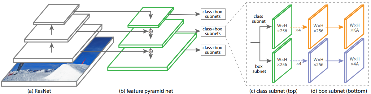 논문에서는 앞에서 제안한 Focal Loss 실험을 위한 RetinaNet 모델을 제안한다. RetinaNet은 FPN(Feature Pyramid Network)을 Backbone으로, 각각 Classification과 Box Regression을 담당하는 Subnet을 사용한다. ResNet 아키텍처의 맨 위에서 FPN을 사용하며 이를 통해 rich, multi-scale convolution feature pyramid를 만들 수 있다.