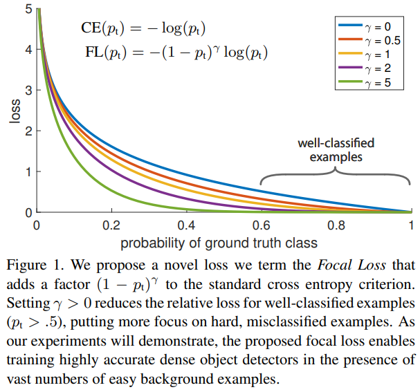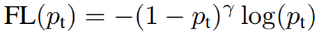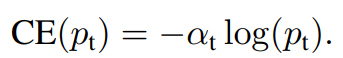 이 Loss는 Focal Loss의 기반이 된다. (Positive와 Negative 사이의 balance를 잡아주지만, Easy와 Hard example에 대해서는 balance를 잡아주지 못함)