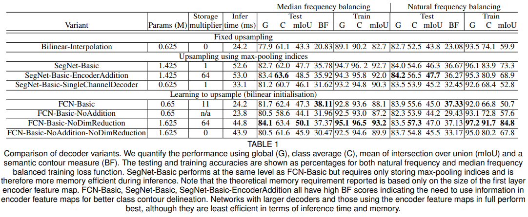 : SegNet-Basic과 동일하지만, Decoder의 Filter가 1개의 채널을 가지게 한다. 이를 통해 parameter를 줄이고 Inference의 속도가 빨라진다.