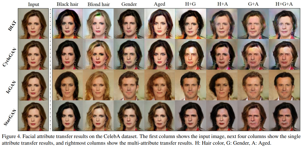 DIAT, CycleGAN, IcGAN 모델의 결과와 실험 결과를 비교하였다.