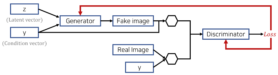 Latent Vector z가 vector 형태라면 y가 [1, 0, 0 ... ] 같이 one-hot-encoding 된 vector 형태로 들어가 z와 concat 되겠지만, 이미지 형태일 경우 이미지의 모든 픽셀 뒤에 해당 vector가 붙게 된다.