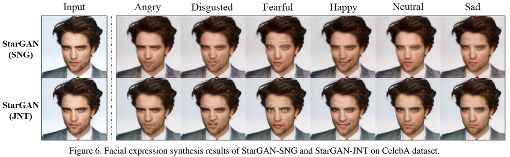 위는 StarGAN을 RaFD 데이터 셋에만 학습, 아래는 RaFD와 CelebA 데이터 셋을 같이 학습시킨 결과로 아래의 케이스가 더 Detail한 Feature를 잘 표현하는 것을 확인할 수 있다.