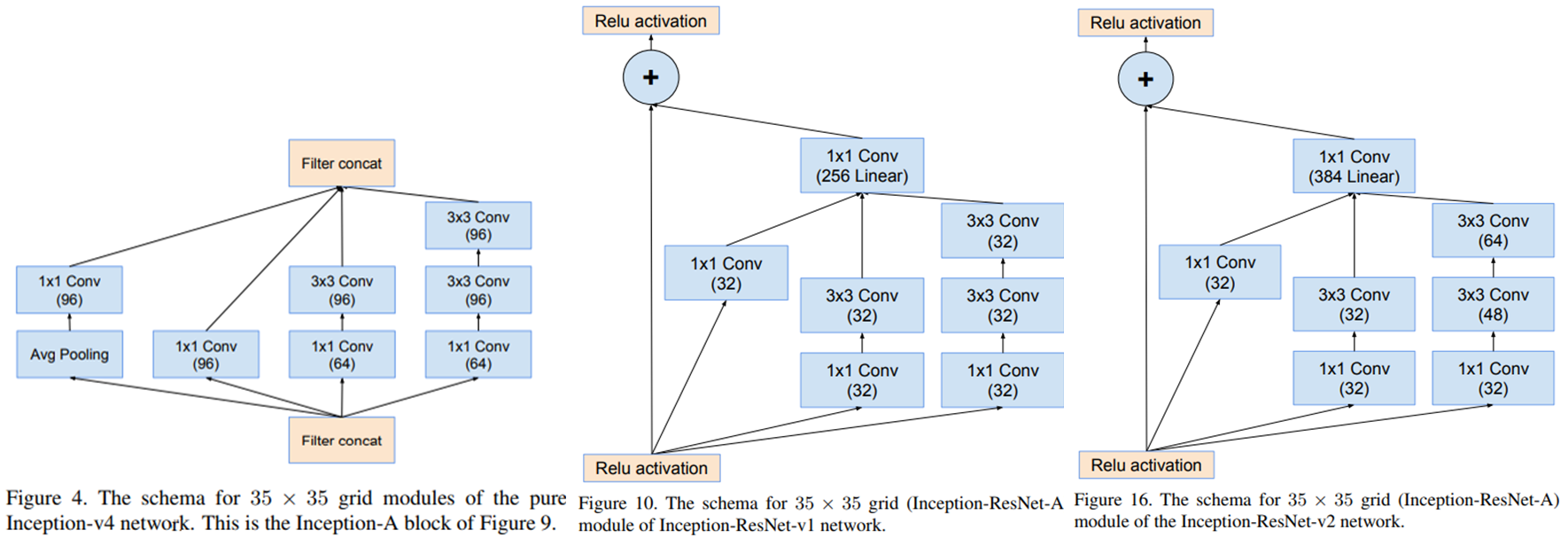 왼쪽 그림은 Inception-v4의 구조, 오른쪽 그림은 Inception-ResNet-v1, v2의 구조이다.