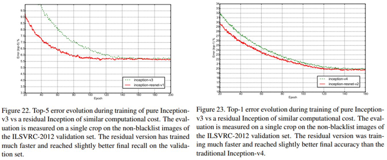 학습 곡선이 비슷한 Inception-v3과 Inception-ResNet-v1, Inception-v4와 Inception-ResNet-v2를 비교하였다.