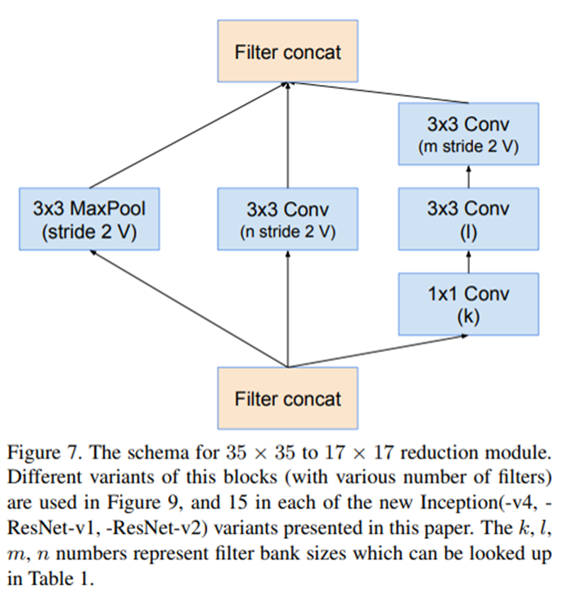Reduction 계층에서는 Grid Size가 절반으로 줄어든다. Inception-v4, Inception-ResNet-v1, Inception-ResNet-v2는 모두 동일한 Reduction-A 구조를 사용한다.