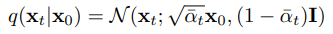 $$\alpha_t := 1 - \beta_t \quad and \quad \bar{\alpha}:= \prod_{s=1}^{t}\alpha_s$$