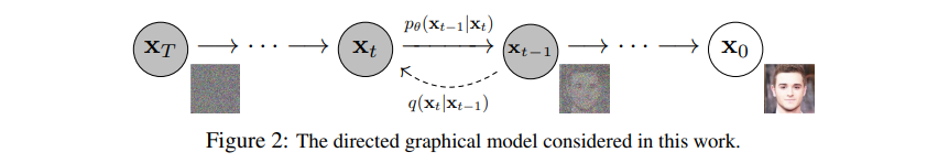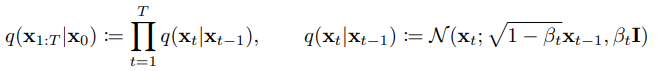 Markov Chain 과정을 거쳐 Data에 점차 Noise를 추가한다. 이 때 $x_t$와 $x_{t-1}$은 모든 과정에 있어 독립하며 Noise가 없는 $x_0$부터 시작해서 Gaussian Noise를 추가하고 마지막 $x_t$는 결국 Gaussian Noise 형태를 띈다.