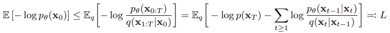 결국 Reverse Process 과정을 통해 $x_t$가 들어왔을 때 $x_{t-1}$를 학습하고 이는 결국 $x_0$까지 내려가게 된다. 이 때 생성된 이미지의 Negative Log Likelihood를 최소화하는 방식으로 위와 같이 Loss Function을 구성하고, 아래와 같이 정리된다.