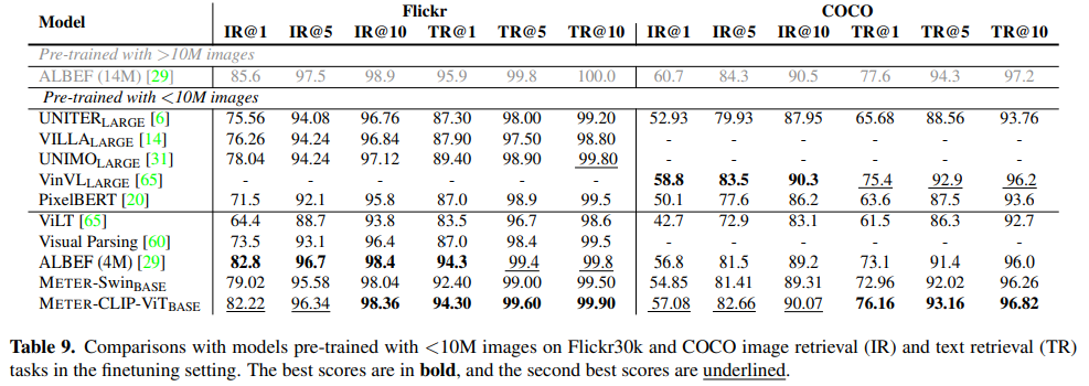 학습 이미지가 10M보다 적은 모델들과의 성능 비교 결과이다. 최종적으로 METER 모델에서 선정한 CLIP Vision Encoder 기반 모델의 성능이 대부분의 데이터에서 좋은 성능을 보이는 것을 확인할 수 있다.