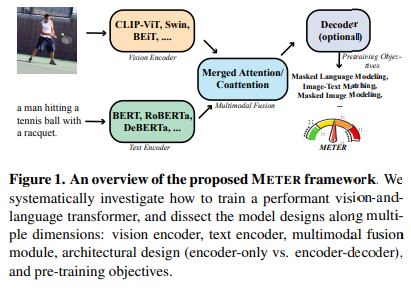 본 논문에서는 Fully Transformer-based Vision-Language model인 METER(Multimodal End-to-end TransformER)를 소개한다. 모델 구조는 크게 5가지로 나누어 실험을 수행하였고 이를 통해 Vision-Language Transformer 모델을 학습하는 방법에 대한 인사이트를 제공한다.