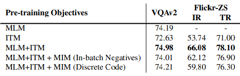 사전학습 기법으로는 MLM과 ITM 기법만을 사용할 때 성능이 가장 좋았다.