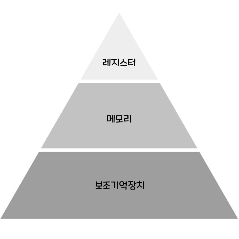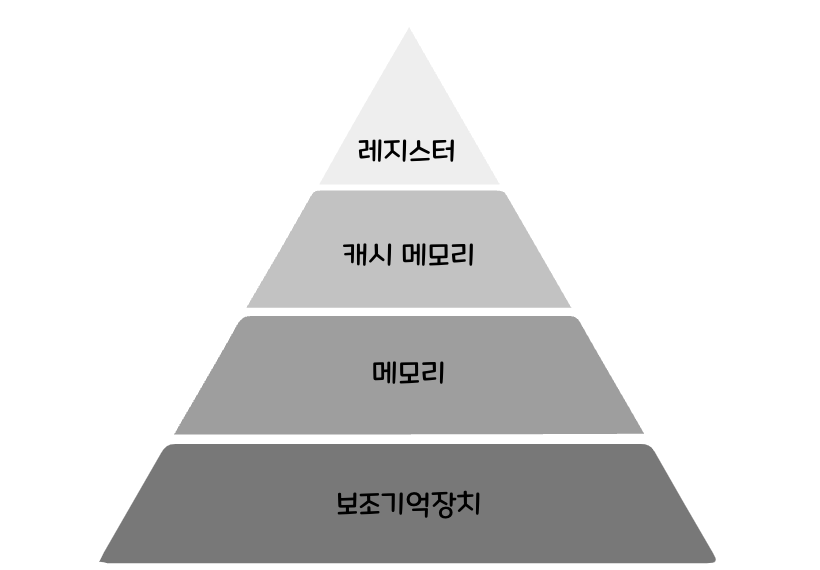 위쪽 계층에 위치할수록 빠르고, 용량이 작고, 비싸며 아래 계층에 위치할 수록 속도가 느리고, 용량이 크며, 가격이 저렴하다.