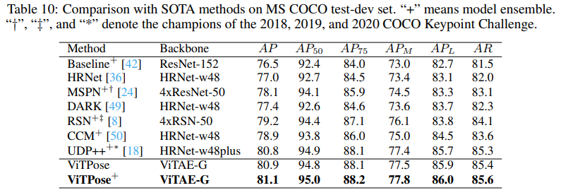 Backbone으로는 1B 개의 파라미터를 가지는 ViTAE-G를 사용하였고 이를 통해 ViTPose는 80.9 AP라는 SOTA를 기록하였다. 3개지 모델을 앙상블한 ViTPose+는 81.1 AP까지 성능을 보이기도 하였다.