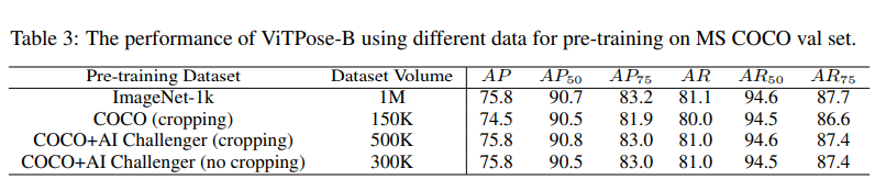 지금까지 많은 모델이 좋은 Initialization을 위해 ImageNet을 가지고 Pretraining을 진행하였다. 하지만 본 논문에서는 Flexibility를 확인하기 위해 MS COCO와 AI Challenger 데이터 셋만으로(ImageNet보다 그 수가 적음) 경쟁력 있는 성능을 달성할 수 있었다. 이는 ViTPose가 다양한 규모의 데이터로부터 Flexible하게 좋은 Initialization을 수행한다고 볼 수 있다.