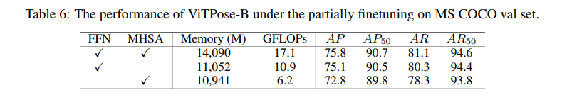 실험을 통해 ViTPose는 MHSA 모듈을 Frozen한 경우가 모든 파라미터를 Unfrozen한 결과와 유사한 것을 확인할 수 있었다.