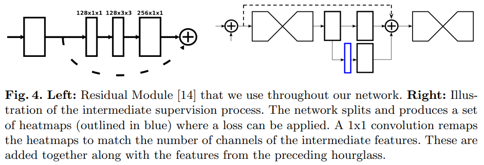 Bottom-Up, Top-Down을 반복적으로 사용하여 각 Hourglass 모듈 내에서 지역적, 전역적 정보들을 통합시킬 수 있고 예측을 생성할 수 있다. 또한 Figure 4에서 볼 수 있듯이 Intermediate Prediction을 추가적인 1x1 Convolution을 통해 더 많은 Channel 수로 매핑한 후 Feature Space에 통합한다. 이러한 Prediction은 이전 Hourglass의 출력 Feature와 함께 Hourglass의 Intermediate Feature에 추가되어 다음 Hourglass의 Input으로 사용된다.