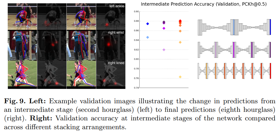 중요한 2가지를 가지고 Ablation Study를 진행한 결과 Hourglass를 쌓고 Intermediate Supervision을 적용하였을 때의 성능이 가장 좋은 것을 확인할 수 있다.