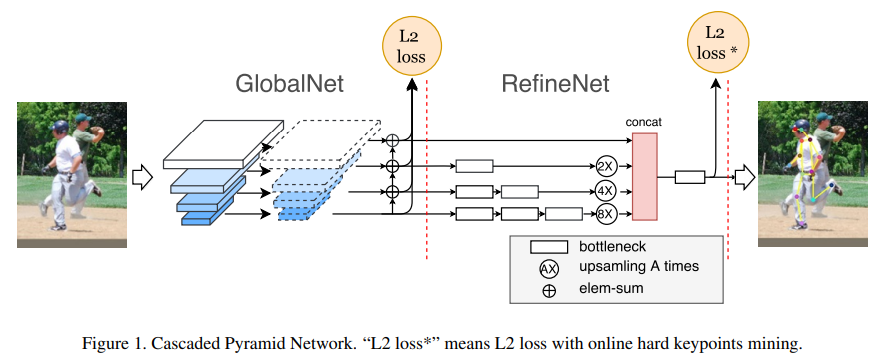 이러한 문제를 해결하기 위해 본 논문에서는 CPN(Cascaded Pyramid Network) 모델을 제안한다. 이 모델의 네트워크는 GlobalNet과 RefineNet 2단계로 구성된다. GlobalNet은 FPN(Feature Pyramid Network)를 기반으로 Occluded되거나 Invisible한 관절에 대한 충분한 Context 정보를 얻을 수 있으며 RefineNet은 OHKM(Online Hard Keypoints Mining) Loss를 기반으로 어려운 Keypoint를 명시적으로 다룬다.