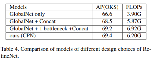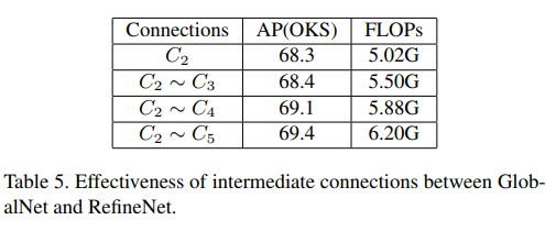 Table 4는 CPN 모델의 디자인 별 실험 성능을 나타낸다. GlobalNet과 RefineNet 구조를 같이 사용하였을 때의 성능이 가장 좋았으며 GlobalNet의 출력으로 생성되는 4가지 Feature Map($C_2 ~ C_5$)을 모두 사용하였을 때 가장 성능이 높은 것을 확인하여 더 많은 수준의 Feature를 사용할 수록 그 성능이 높아지는 것을 알 수 있었다(Table 5)