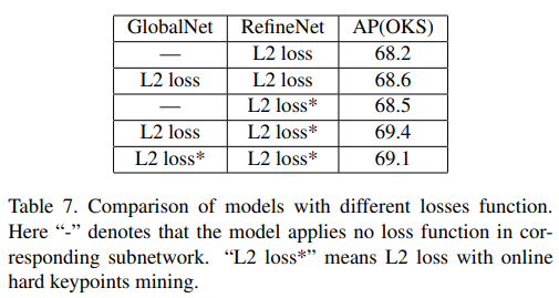 실험 결과 GlobalNet에서는 L2 Loss를, RefineNet에서는 OHKM Loss를 사용할 때의 성능이 가장 좋았다.