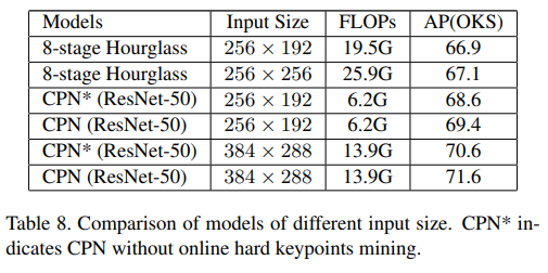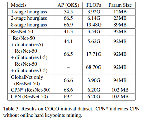 Table 3을 보면 CPN 모델이 8-stage Hourglass 모델이나 Dilation을 적용한 ResNet 모델보다 AP와 FLOPs 모두에서 성능이 더 좋은 것을 확인할 수 있다. OHKM을 사용하였을 때 성능이 더 좋았던 것 또한 확인할 수 있다.