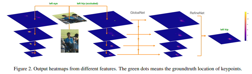이러한 문제점을 극복하기 위해 본 논문에서는 U자형 구조를 가지는 FPN 모델을 활용하였다. 약간의 다른점은 Upsampling 과정에서 Element 합 이전에 1x1 Convolution을 진행한다는 점이다. GlobalNet에서는 Figure 2에서 볼 수 있듯이 많은 Context 정보가 필요한 Hip같은 Keypoint를 잘 잡아내지 못한다. 따라서 이러한 어려운 Keypoint들을 잘 잡아내기 위해 RefineNet을 사용한다.