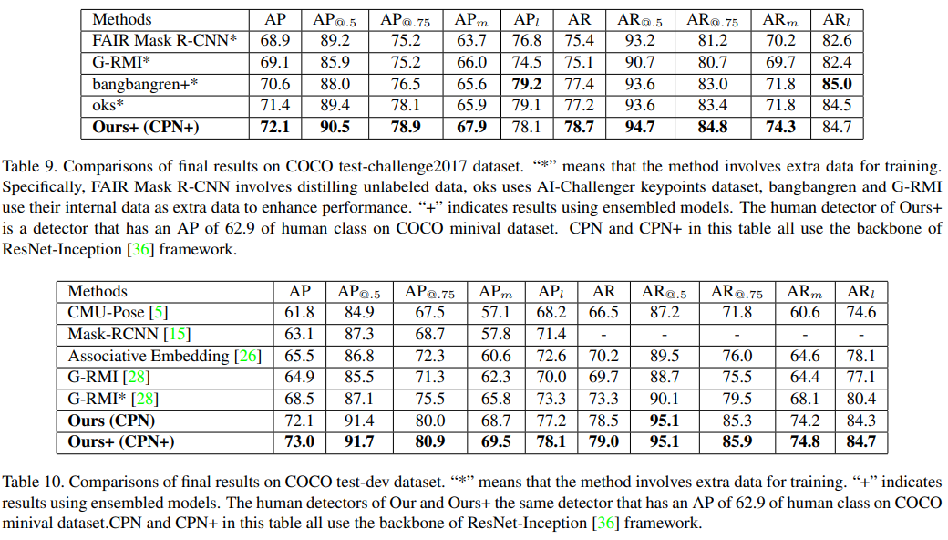 - GlobalNet과 OHKM을 기반으로 한 RefineNet을 통합한 CPN 모델을 제안한다.