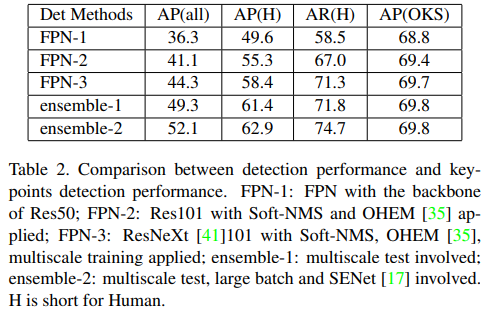 Detector의 NMS threshold에 따른 성능 변화에 대한 실험 결과와 Detection AP와 Keypoint AP의 연관성을 실험한 결과이다. Detection 성능이 올라갈 수록 Keypoint의 성능도 올라가지만 성능이 높아질 수록 그 정도가 약해지는 것을 확인할 수 있다. 이를 바탕으로 논문에서는 Bounding Box의 성능도 중요하지만 어려운 Keypoint를 잘 찾는 것이 중요하다고 말하고 있다.