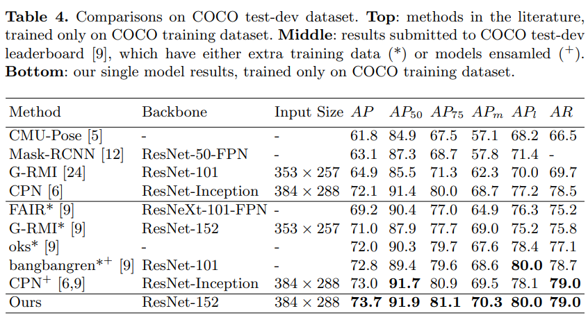 Test : 테스트 과정에서는 2단계의 Top-Down 패러다임이 적용된다. Faster RCNN Detector를 사용하며 Hourglass 모델이 그랬던 것처럼 원본 이미지와 뒤집힌 이미지의 평균 Heatmap을 활용하여 Joint 위치를 예측한다. 또한 최종 예측 전에 가장 점수가 높은 Response에서 두번째로 높은 Response 방향으로 1/4 Offset이 적용된다.