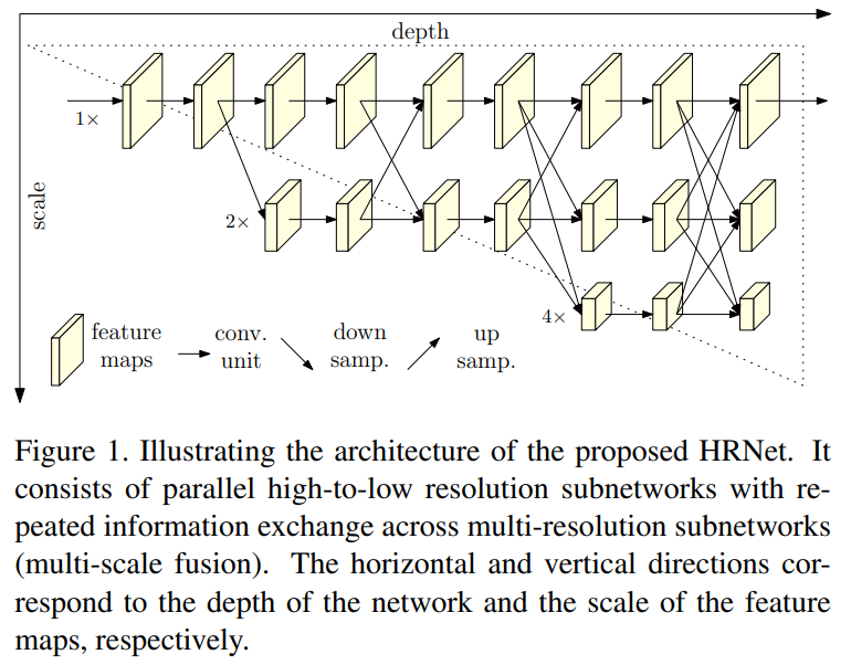 하지만 이러한 구조는 전체 네트워크에서 고해상도 Representation을 유지할 수 없기 때문에 본 논문에서는 이러한 단점을 보완한 HRNet(High-Resolution Net)을 제안한다. 네트워크 구조는 Figure 1에서 볼 수 있듯이 고해상도에서 저해상도로 이어지는 SubNetwork를 하나씩 추가해 더 많은 Stage를 형성하며 다중 해상도 SubNetwork를 병렬로 연결한다. 이렇게 만든 병렬 다중 해상도 SubNetwork는 정보를 서로 반복적으로 교환하며 Multi-Scale Fusion을 수행한다.