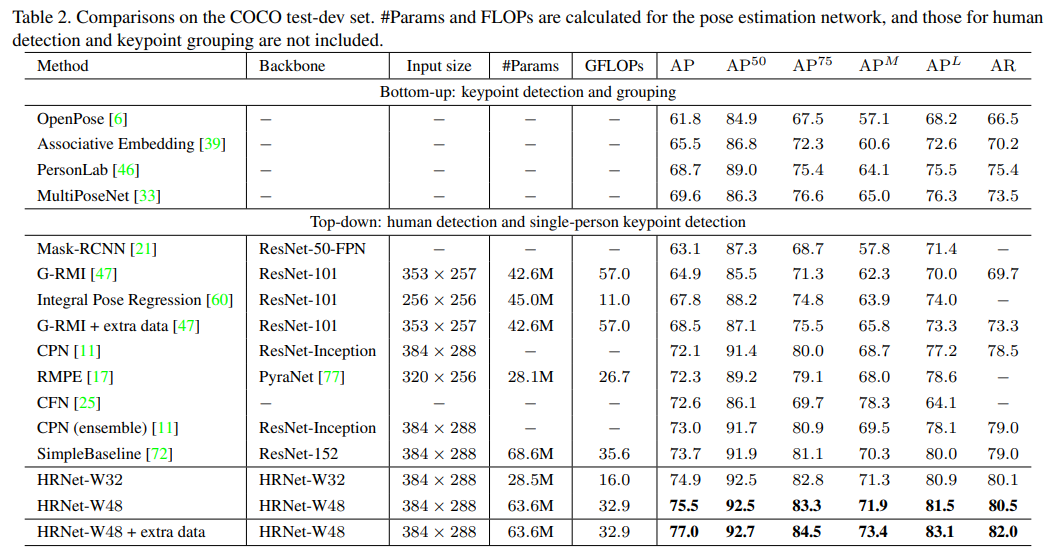 사용한 Metric은 OKS(Object Keypoint Similarity)이며 이에 대한 Precision과 Recall을 계산하였다. Top-Down 방식의 모델이기 때문에 Detection 결과를 Height : Width=4:3으로 맞추었고 이 때의 이미지 크기는 256x192 or 384x288이 된다. 자세한 Train Detail은 논문을 참고.