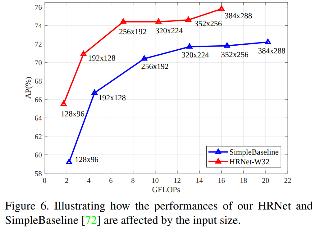 Input Size 변화에 따른 실험 결과 모든 해상도에서 HRNet의 성능이 기존 Simple Baseline 모델의 성능을 뛰어 넘었다. 결국 이러한 실험들을 통해 HRNet의 디자인이 다중 해상도 정보를 효율적으로 결합하고 있다는 것을 알 수 있었다.