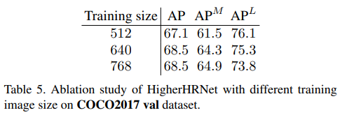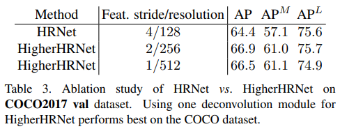 HRNet -> HigherHRNet으로 갈때에는 Deconvolution 모듈을 하나 추가하였다. $AP^M$은 Medium Person을 의미하며, 해상도가 높아질수록 작은 크기의 사람을 잘 잡는 것을 확인할 수 있다.