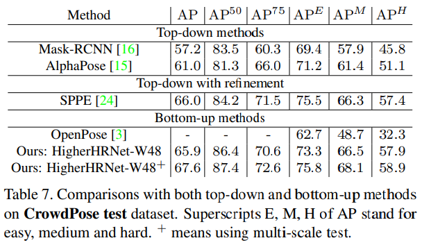 Bottom-Up 방식은 Scale Variation 때문에 작은 사람의 Pose를 잘 잡아내지 못하는 문제가 있었는데, HigherNet에서 제안하는 Multi-Resolution Supervision과 Multi-Resolution Aggregation으로 이러한 문제를 덜 수 있었다. 때문에 이전까지의 Bottom-Up 방식 모델보다 더 좋은 성능을 얻을 수 있었다.
