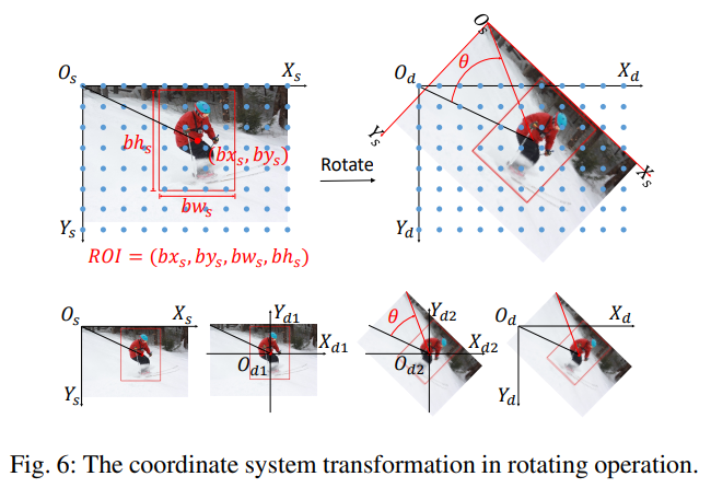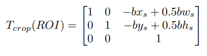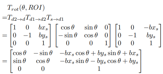 Rotate는 특정 ROI를 기준으로 수행되며 좌표계의 중심 대신 ROI의 중심이 회전 중심이 된다. 이 때 ROI는 Top-Down 방식에서는 Bounding Box를, Bottom-Up 방식에서는 전체 이미지를 의미한다. 회전 변환은 3가지 기본 변환의 조합으로 이루어지며 이를 결합하면 아래와 같다.