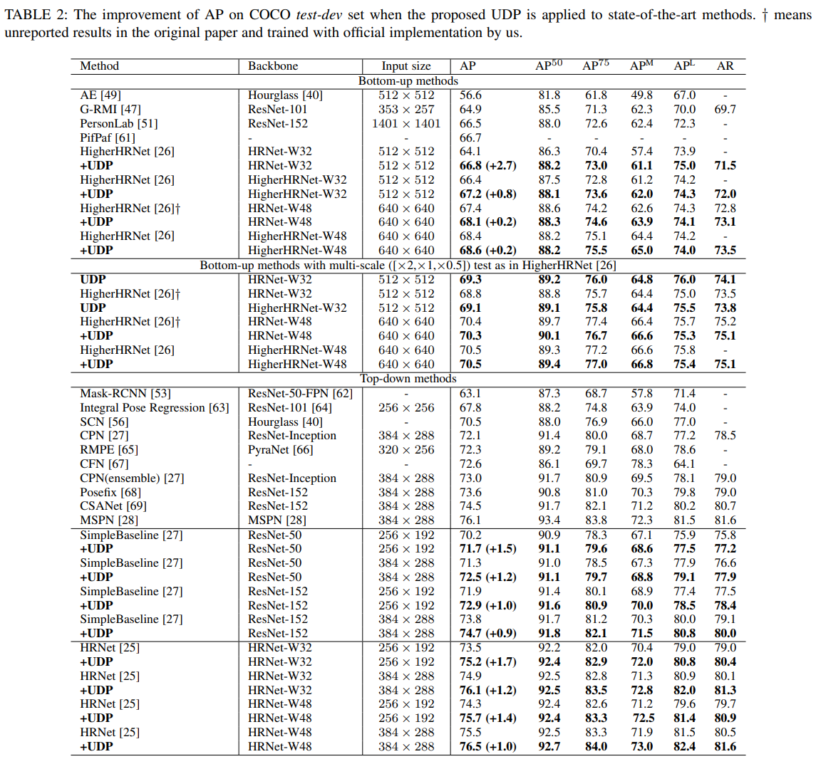 Bottom-Up 방식에서는 HigherHRNet, Top-Down 방식에서는 SimpleBaseline과 HRNet을 기준 모델로 사용하여 UDP 방법을 적용한 결과와 성능을 비교하였다. Unbiased Keypoint Format Transformation 방법으로는 Combined Classification and Regression Format 방식을 사용하였다.