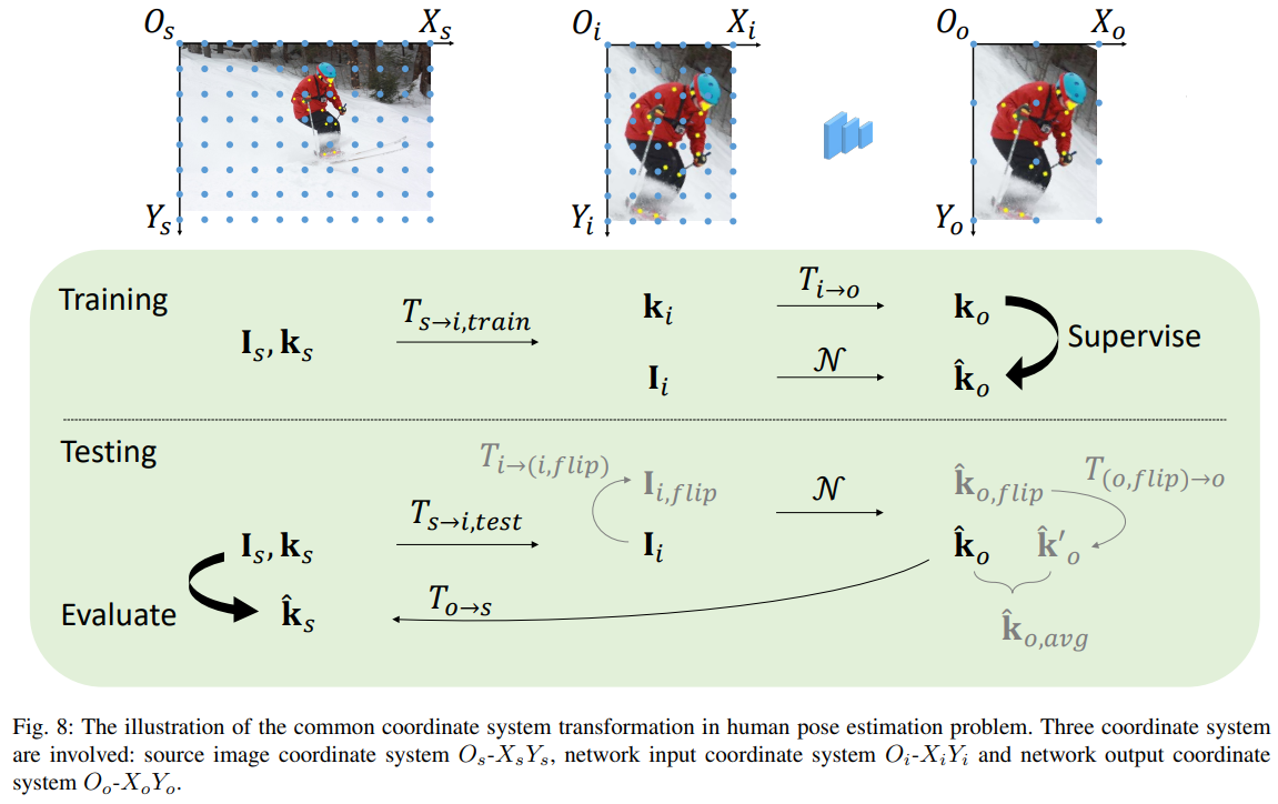 Human Pose Estimation에서의 Data Processing은 주로 Coordinate System Transformation과 Keypoint Format Transformation으로 나타난다. Coordinate System Transformation은 Cropping, Resizing, Rotating같은 작업을 수행하며 데이터(Keypoint나 이미지 Matrix)를 다른 Coordinate로 바꾸는 것을 의미한다. CPN, SimpleBaseline, HRNet 등 최신 모델들은 이미지 크기를 조정할 때 픽셀을 사용하는데 이 때 Flipping을 사용할 경우 결과가 맞지 않고 bias가 발생한다. 이런 오류를 억제하기 위해 기존 모델들은 Flipping된 이미지 결과를 1 픽셀 움직이거나(SimpleBaseline, HRNet, Darkpose) 좌표계 평균을 2 픽셀 움직이기도 하였다(CPN, MSPN).