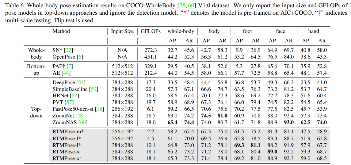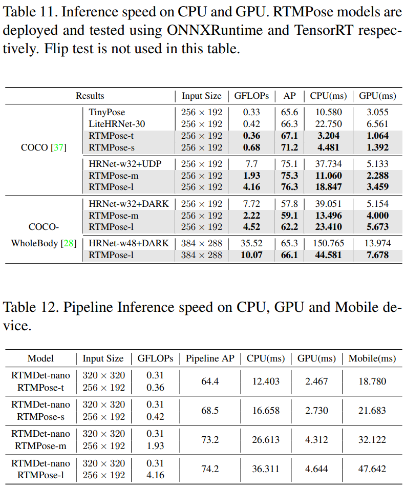 Table 4를 보면, COCO Dataset에서 RTMPose의 성능이 경쟁 모델들의 성능보다 크게 높은 것을 확인할 수 있다.