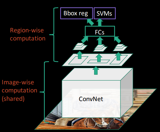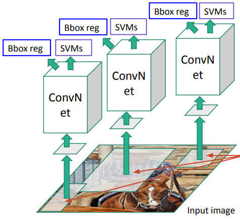 Selective Search를 통해 우리가 주목해야할 RoI들을 찾았다면 해당 영역을 딥러닝 모델에 넣기 위해 고정된 크기를 가진 Bounding Box 형태로 변환한다. 그리고는 각 Box들을 ConvNet에 통과시키는데 이때 마지막 Layer를 Feature Vector로 사용하여 SVM(Support Vector Machine)의 입력으로 사용한다. 결국 이 SVM 모델이 Class라벨을 예측(Classification)하고, Region Proposal로 Bounding Box를 조정하여 최종 BBox를 예측한다.