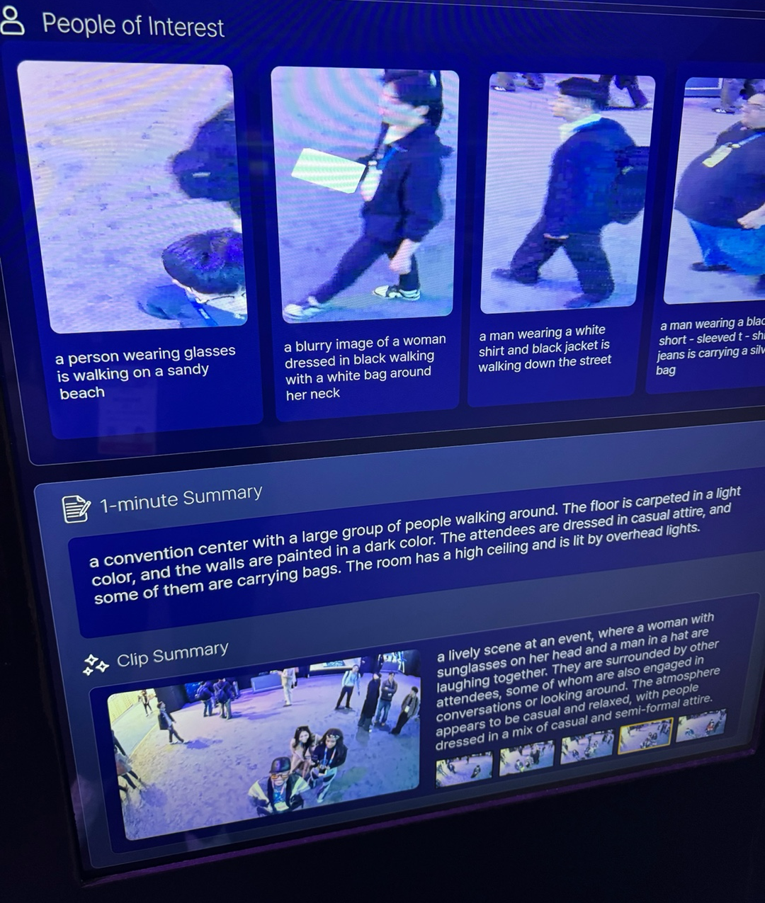 다른 대기업 부스 중에 기억나는 부분은 SK의 인공지능을 활용한 캡셔닝 시스템이었는데 아래 이미지와 같이 사람이 지나다니면 CCTV를 활용하여 해당 사람이 누구이고 무엇을 하고 있는지를 캡션으로 달아주는 시스템이었다. 관심있는 분야이기에 오래 지켜보았는데 다행히도(?) 아직 대기업 제품임에도 정확도가 100이 아니라는 점이 아직 내가 연구해 나갈 길이 남아 있구나라는 희망을 가지게 해주었다. 물론 학습 데이터 싸움일 수 있지만, 이미지로 성별을 예측하는 프로그램을 만들어본 경험이 있어 그 Task가 어렵다는 것을 알기에 어떻게 하면 모델을 더 잘 학습시킬 수 있을지 고민해보고 싶다.